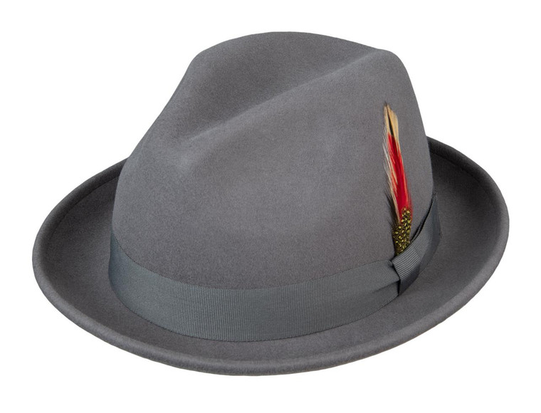 This is our best selling wool felt fedora brought back to the most classic styling. Coordinating grosgrain ribbon band with a double half bow and feather. 2" snap brim. Matching grosgrain sweatband. Unlined.